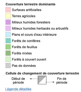 Interprétation des résultats : L’objectif des comptes des terres est d’observer des tendances sur de vastes portions du territoire et non pas de qualifier l’évolution d’une parcelle précise, ainsi les données de couverture terrestre sont à interpréter avec prudence. Les changements par décennie sont présentés en format simplifié par défaut. Les différents types de forêts et de milieux humides sont regroupés en deux classes distinctes. Les changements détaillés sont accessibles à partir du contrôle des couches.