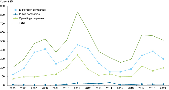 Evolution of exploration and deposit appraisal work expenditures by type of stakeholder, Québec, 2005-2019¹ (in current $M)