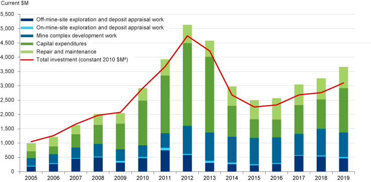 Mining investment including all exploration and deposit appraisal expenditures, expenditures on development work to bring a mine to production and to renew mineral reserves, on infrastructure construction and equipment and machinery acquisition, as well as on repair and maintenance required to maintain the value of capital assets.