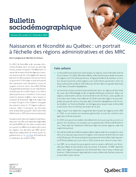 Comparaison de la fécondité, de l’âge à la maternité, des pays d’origine et de la situation conjugale des parents dans les 17 régions administratives. Certaines données sont également présentées pour les 104 municipalités régionales de comté (MRC).