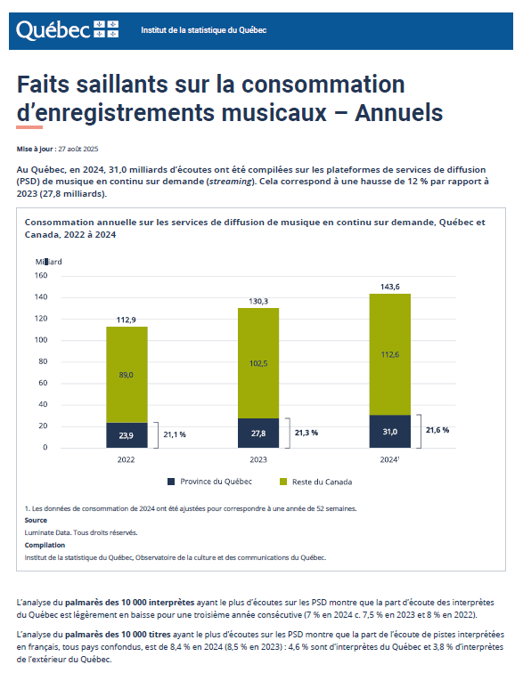 Au Québec, en 2024, 31,0 milliards d’écoutes ont été compilées sur les plateformes de services de diffusion (PSD) de musique en continu sur demande (streaming). Cela correspond à une hausse de 12 % par rapport à 2023 (27,8 milliards).