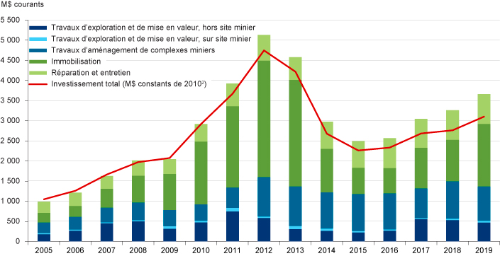 Investissement minier comprenant l’ensemble des dépenses en travaux d’exploration et de mise en valeur d’un gîte minéral, les dépenses en travaux d’aménagement nécessaires à la mise en production d’une mine et au renouvellement des réserves de minerai, le coût de la construction d’infrastructures et de l’acquisition d’équipement et de machinerie liés au complexe minier, ainsi que les coûts de réparation et d’entretien requis pour maintenir la valeur des immobilisations.