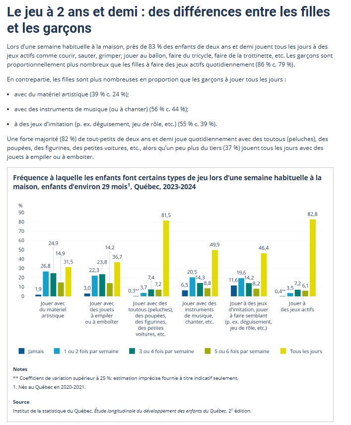 Fréquence à laquelle les enfants font certains types de jeu lors d’une semaine habituelle à la maison, enfants d’environ 29 mois1, Québec, 2023-2024