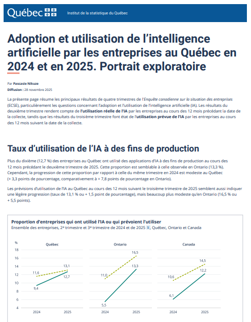Plus du dixième (12,7 %) des entreprises au Québec ont utilisé des applications d’intelligence artificielle (IA) à des fins de production au cours des 12 mois précédant le deuxième trimestre de 2025.